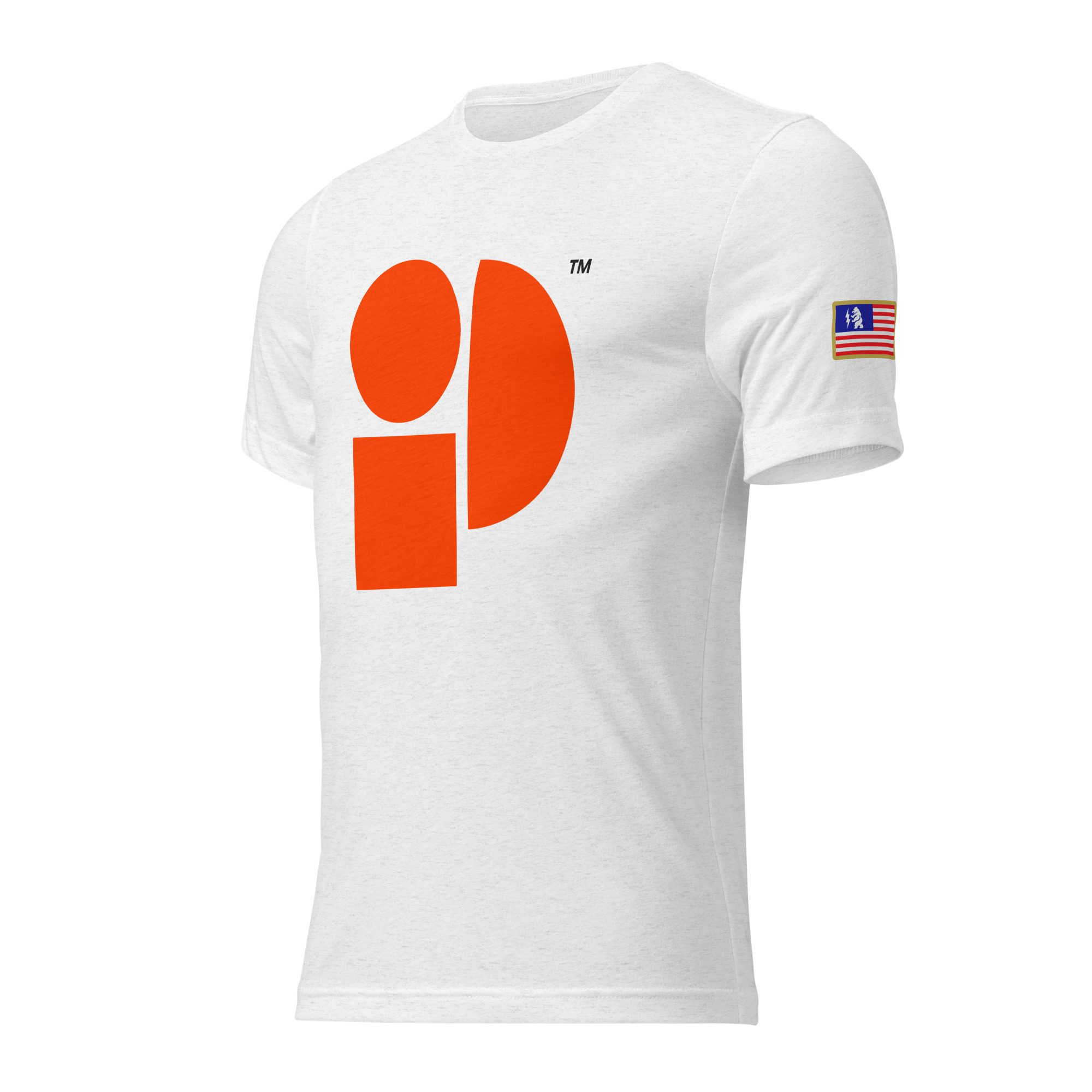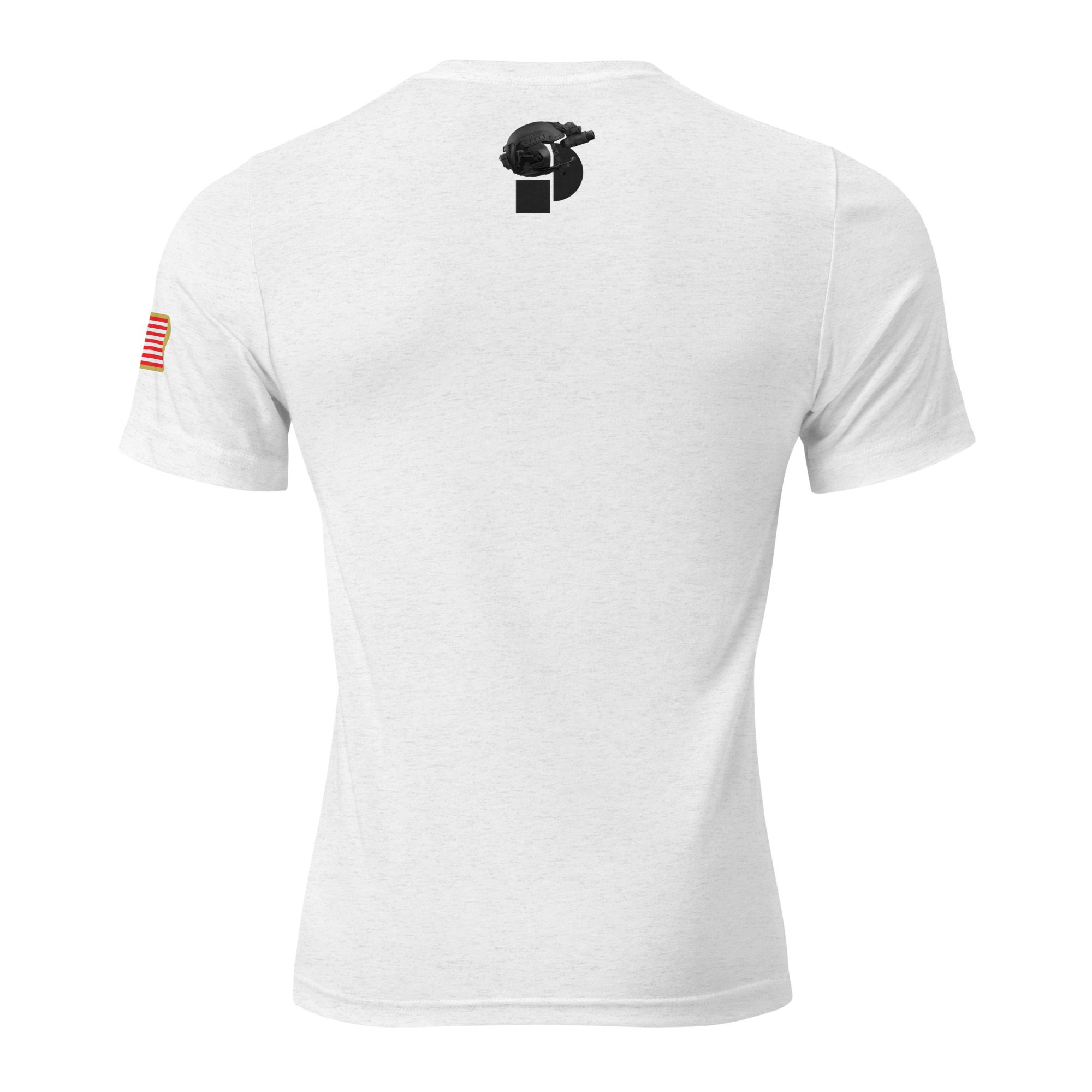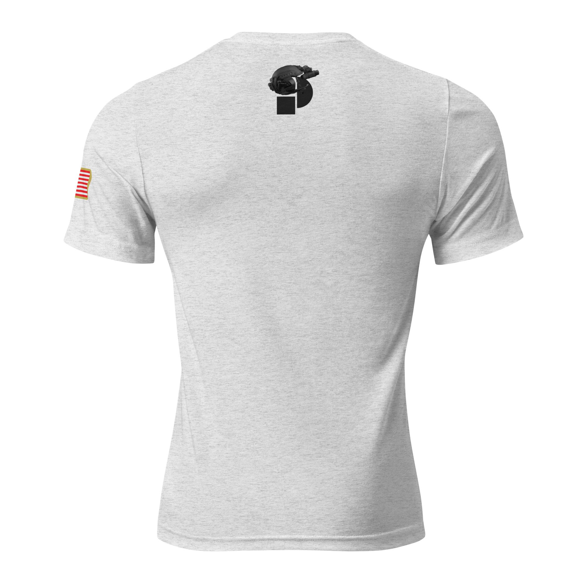 Orange logo on front, American Flag on left sleeve, and Peter MD logo with tactical gear on back.